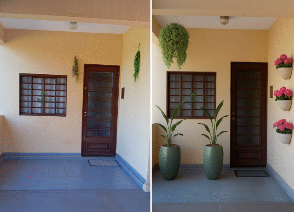 Na imagem ao lado, um projeto simples e barato. Algumas plantas em uma entrada de garagem renovada. Olha como a casa ganha vida. Poderíamos inserir mais pendentes e brincado com os elementos, contudo a ideia é mostrar que com pouco investimento você pode mudar sua casa. Vamos fazer algo para o seu espaço, você merece um lugar mais bonito.